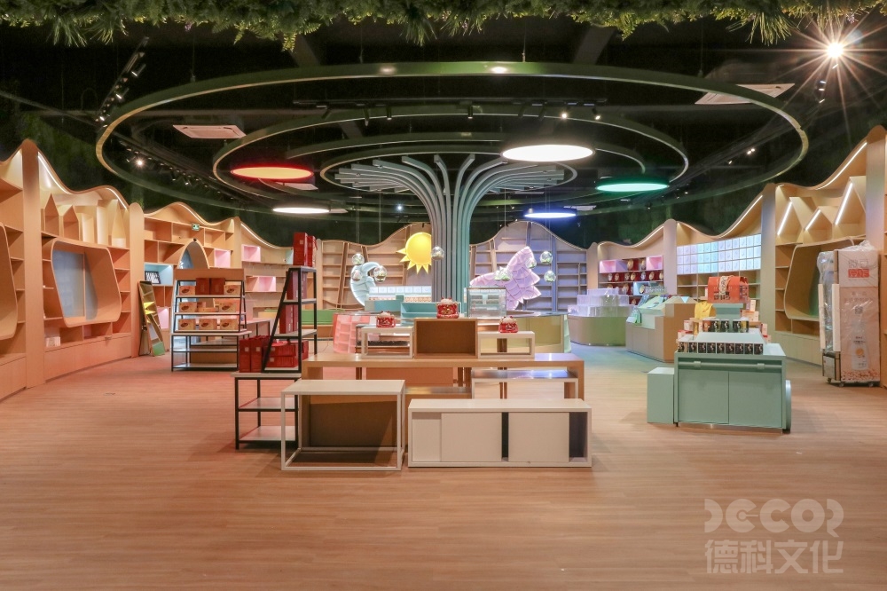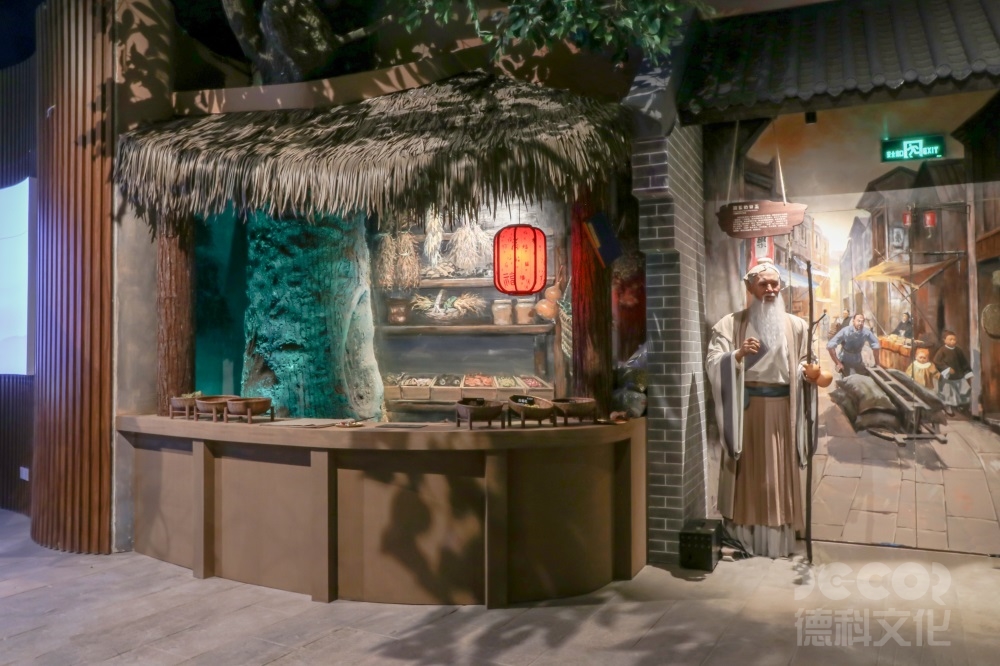 百草园外形像一朵五叶梅,绽放在岭南大地绿野上,依山面水。德科设计人员根据中医药主题,设计了“神农秘境”、“尚合堂”、“膳食馆”、“五行养生堂”、“文创市集”、“DIY手作坊”、“六和堂”及“酷玩瓦舍”八个主题展厅。