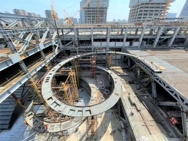 在单体内部,有约200米长的旋转坡道,重量约为280吨。面板、底板、横隔板和内隔板密集排列,焊接工作量巨大。在有限施工空间内,建设者们利用高空拼装施工工艺,以吊索进行出装预拼,再对吊索分批次分阶段预应力张拉,促使旋转坡道完成最终受力体系转换,完成拼接。